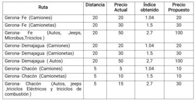 El Consejo de la Administración Municipal de la Isla de la Juventud, en reunión ordinaria del veinticinco de noviembre del 2025, aprobó, de manera unánime, una modificación de las tarifas de precios a los viajes de los Portadores Privados Automotor que circulan en el territorio. Dichas tarifas se exponen a continuación: