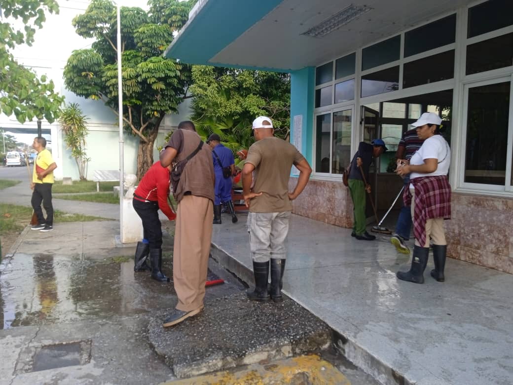 Yusmari Olivera Pupo, secretaria general de la CTC municipal, junto a los trabajadores del Sindicato de Transporte, Puerto y la Aviación Civil, participaron en una jornada de higienización en el hospital general docente Héroes del Baire, que abarcó a las cuatro plantas de esa importante unidad de salud pinera, a la sala de observación, el parqueo y las áreas verdes.