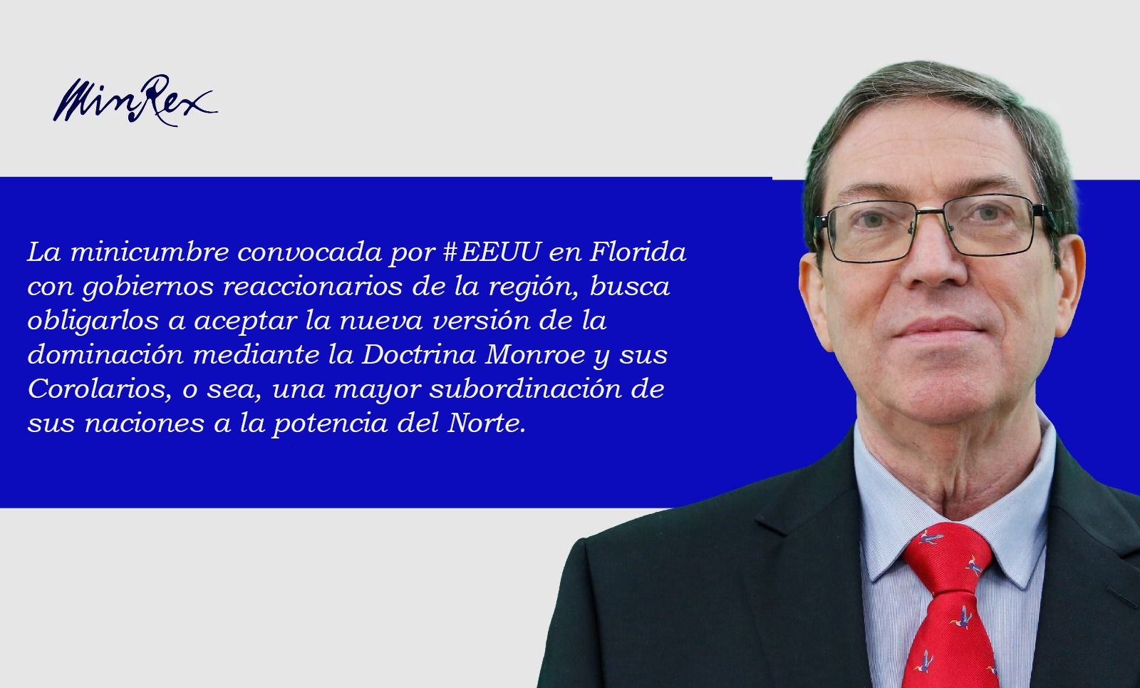 La Habana, Bruno Rodríguez Parrilla, ministro de Relaciones Exteriores de Cuba, denunció en redes sociales que la minicumbre convocada por Estados Unidos en Florida con gobiernos reaccionarios de la región buscó imponer “la nueva versión de la dominación mediante la Doctrina Monroe y sus Corolarios”.
