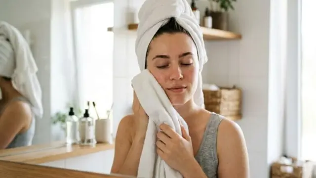 Secar el rostro arrastrando la toalla es un error, ya que irrita la piel y empeora la tirantez. En su lugar, presiona suavemente con la toalla para absorber la humedad.